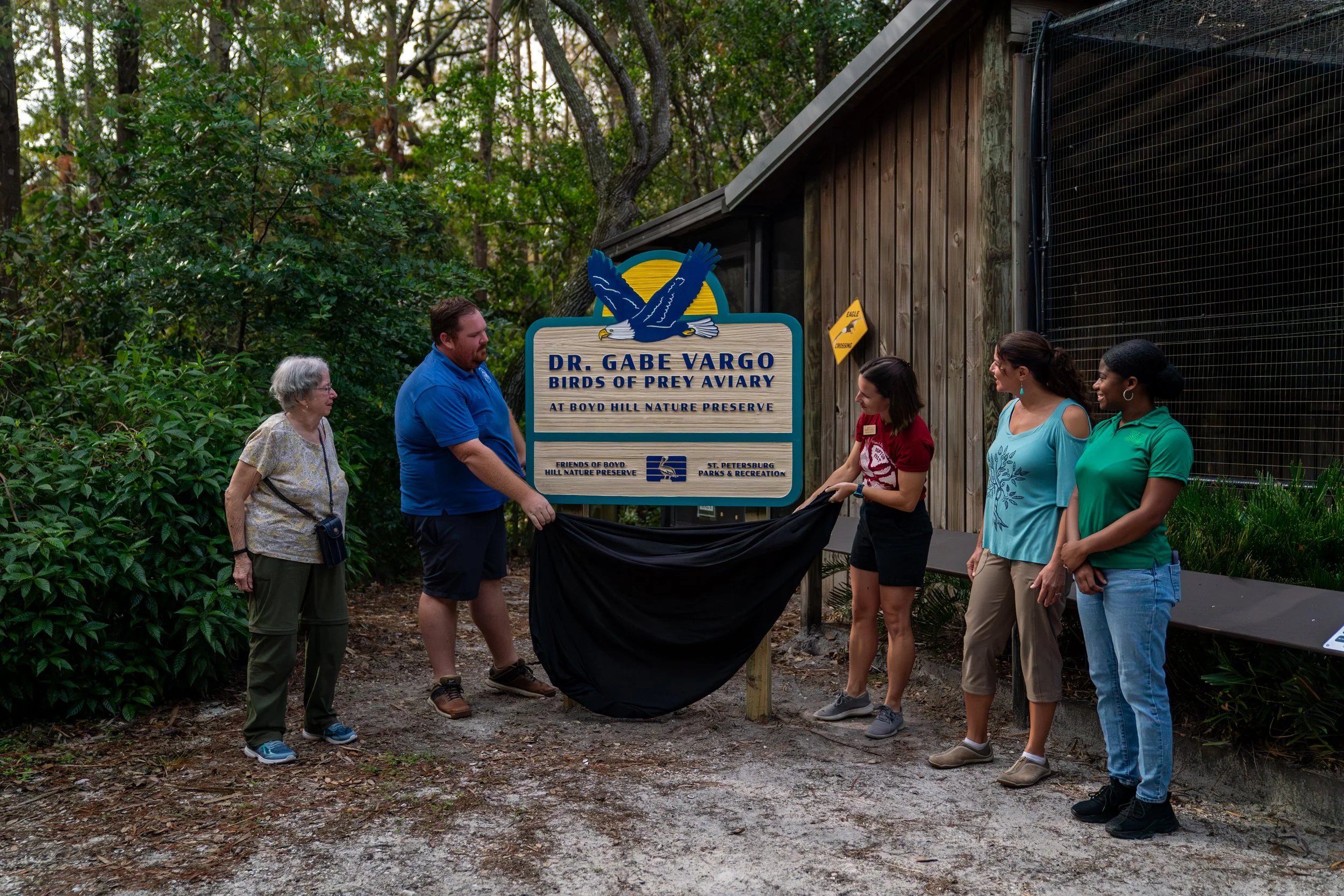 The Bird of Prey Program is a partnership between the Friends of Boyd Hill and the City of St. Petersburg. Both organizations share costs for food, shelter, and veterinary services, as well as responsibility for the birds' care and well-being.